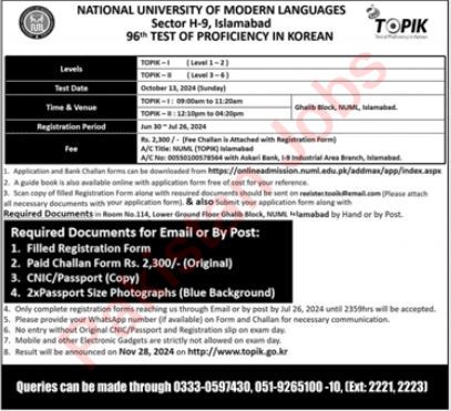 National University of Modern Languages NUML jobs advertisement dated about 30 June 2024 in daily Jang Newspaper invites application for the vacant post of korean language test in Islamabad, islamabad Islamabad Pakistan. Persons with Bachelor, MS and Master etc. education can apply.