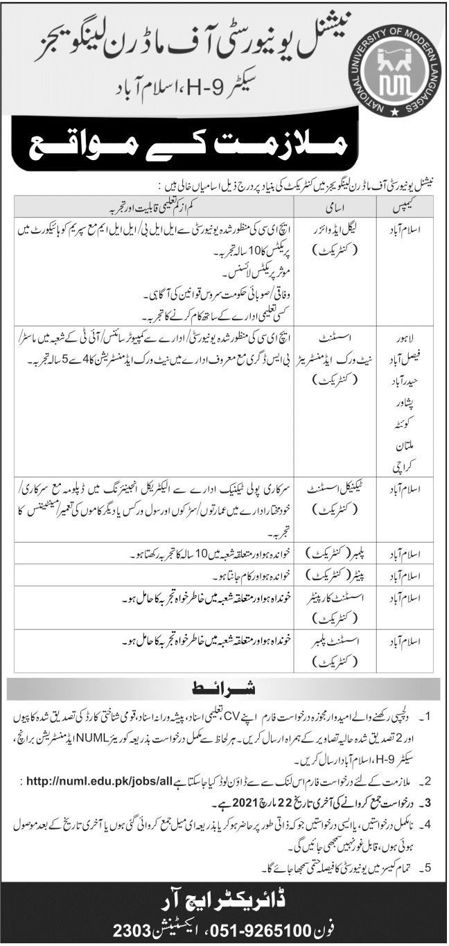 National University of Modern Languages NUML is seeking applications from highly qualified and experienced individuals for the posts of Legal Advisor, Assistant Network Administrator, Technical Assistant, Plumber, Painter, Assistant Carpenter and Assistant Plumber.