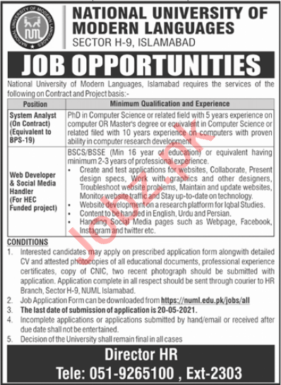 Vacancies in National University of Modern Languages NUML Advertisement May 2021