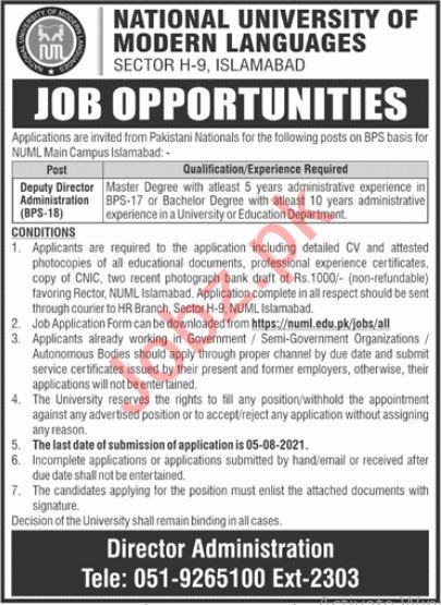Vacancies in National University of Modern Languages NUML Advertisement July 2021
