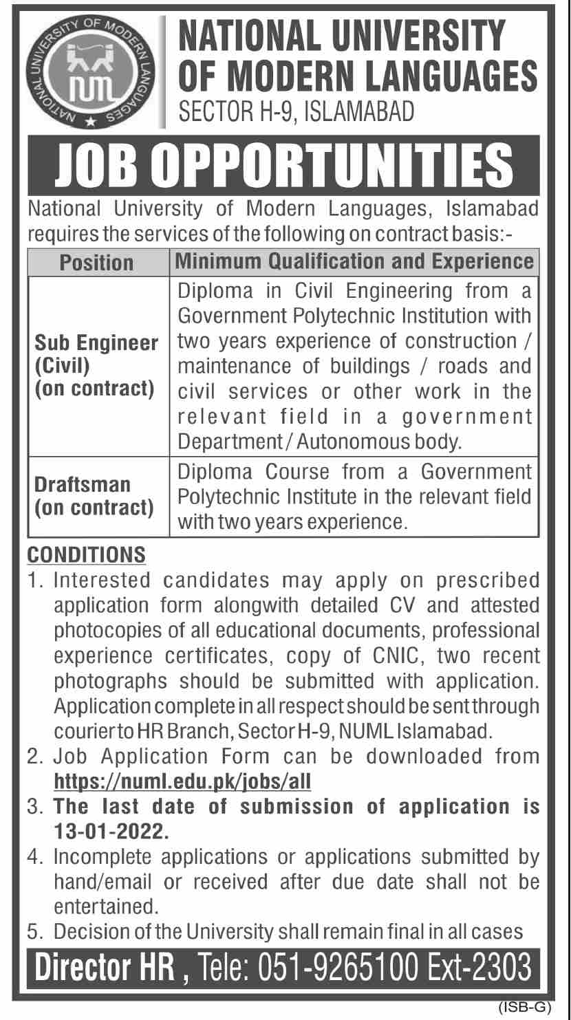 Vacancies in National University of Modern Languages NUML Advertisement December 2021