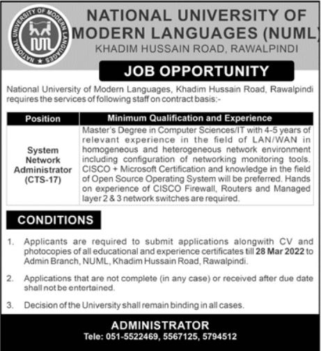 National University of Modern Languages NUML jobs advertisement dated about 13 March 2022 in daily Jang Newspaper invites application for the vacant post of system network administrator in Rawalpindi, rawalpindi Punjab Pakistan. Master, MCS and MIT etc. educational qualification will be preferred.