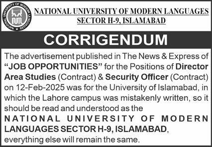 Vacant posts including director area studies and security guard are announced in National University of Modern Languages NUML Islamabad, islamabad Islamabad Pakistan as per 13 February 2025 advertisement in daily Express Newspaper. Preferred Education is Bachelor, Master and Mphil etc.