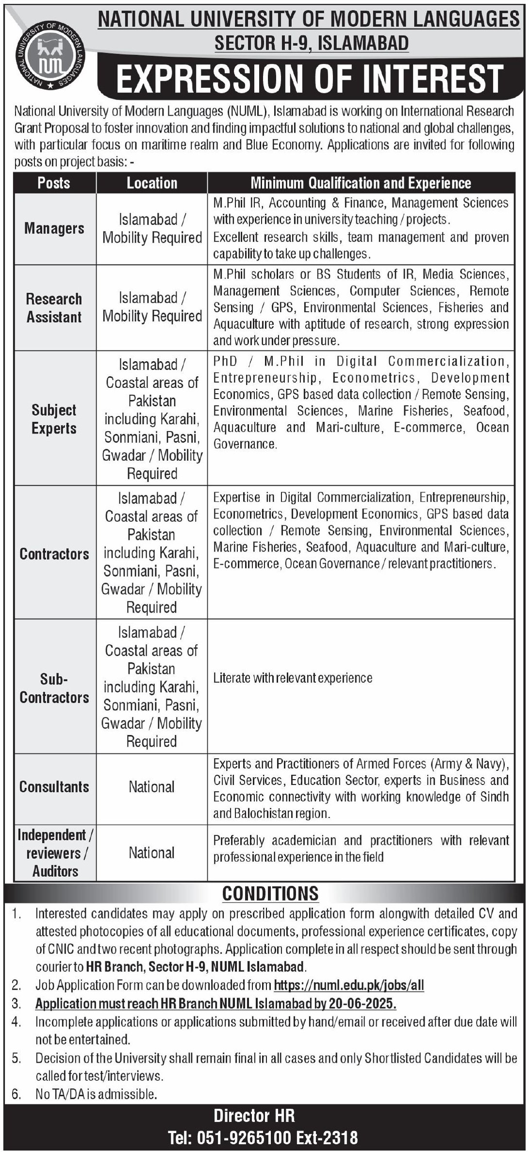National University of Modern Languages NUML is looking for candidates for following posts as per job advertisement published in daily Express Tribune Newspaper of June 6, 2025 for location H-9 Islamabad, islamabad Islamabad Pakistan: