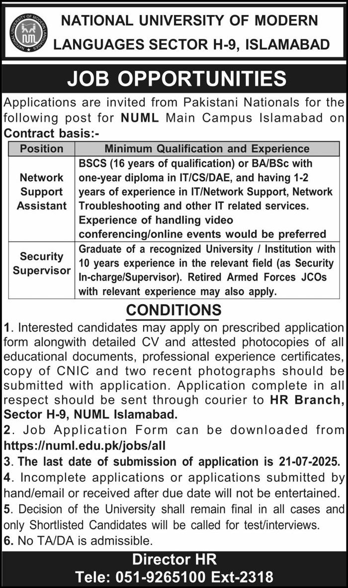 National University of Modern Languages NUML jobs advertisement dated about 5 July 2025 in daily Pakistan Observer Newspaper invites application for the vacant post of network support assistant and security supervisor in H-9 Islamabad, islamabad Islamabad Pakistan. Preferred Education is BCS, BIT, DAE, Bachelor and Others etc.