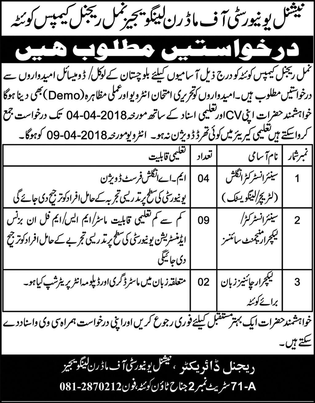 Latest National University of Modern Languages NUML Teaching Posts Quetta 2025