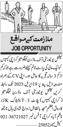 National University of Modern Languages NUML jobs advertisement dated about 12 April 2023 in daily Jang Newspaper invites application for the vacant post of mali and gardener in Karachi, karachi Sindh Pakistan. Candidates with Primary etc. educational background will be preferred.