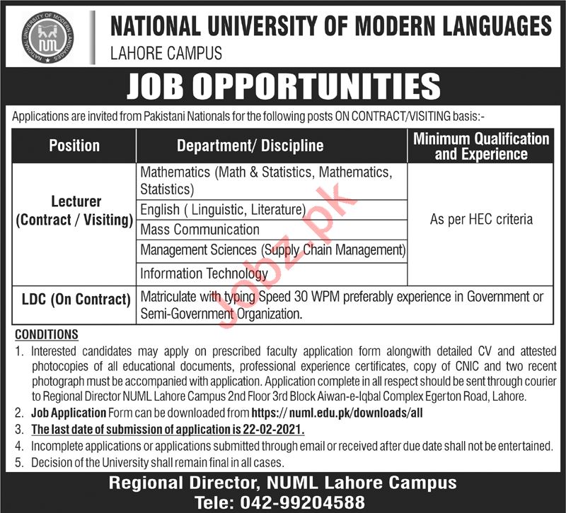 Vacancies in National University of Modern Languages NUML Advertisement February 2021