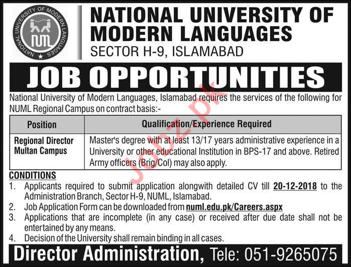 Vacancies in National University of Modern Languages NUML Advertisement December 2018