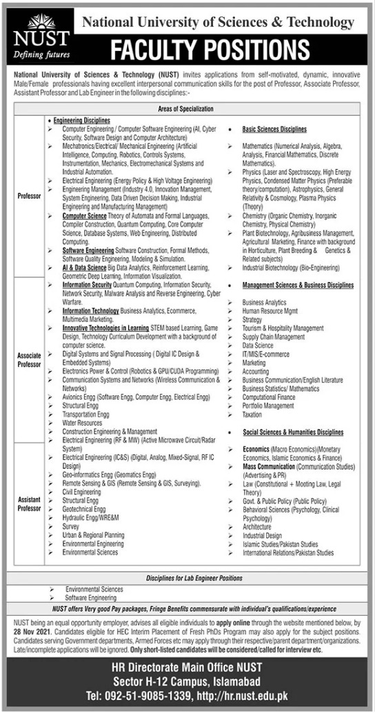 Vacancies in National University of Science & Technology NUST Advertisement November 2021