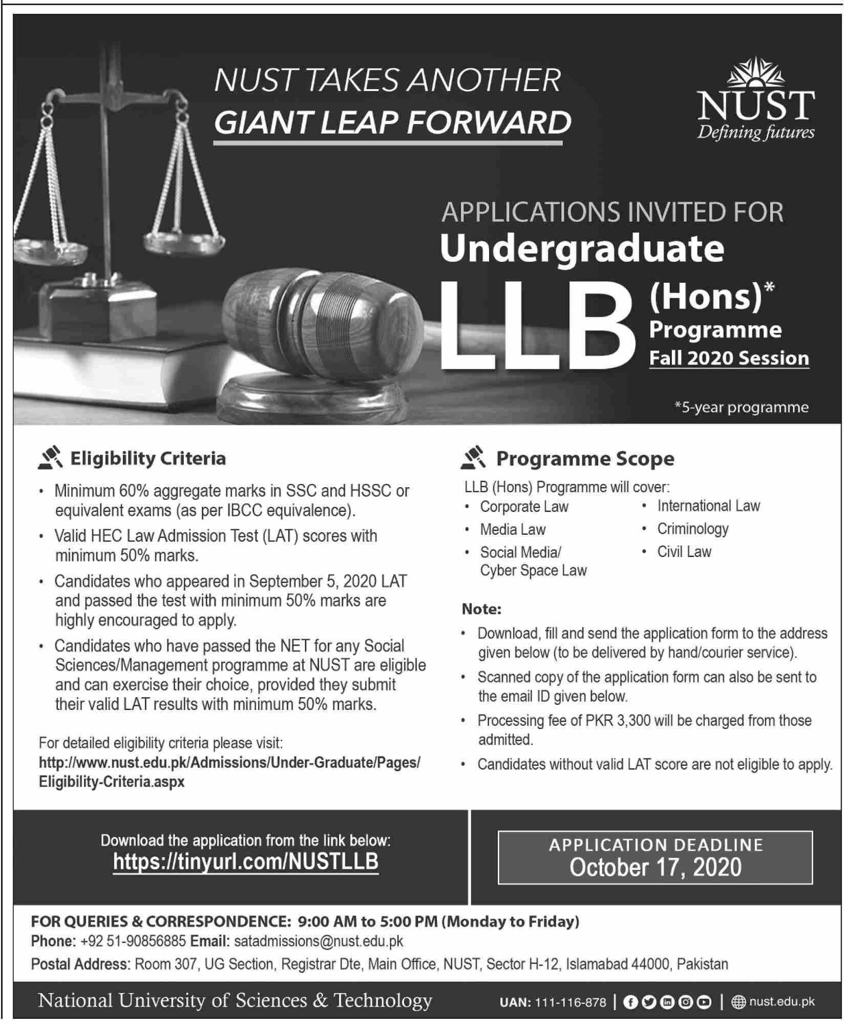 National University of Science & Technology NUST is offering admissions in Undergraduate Bachelor of Laws LLB Hons Programme in Islamabad Pakistan 2020. Read newspaper ad for exact details.