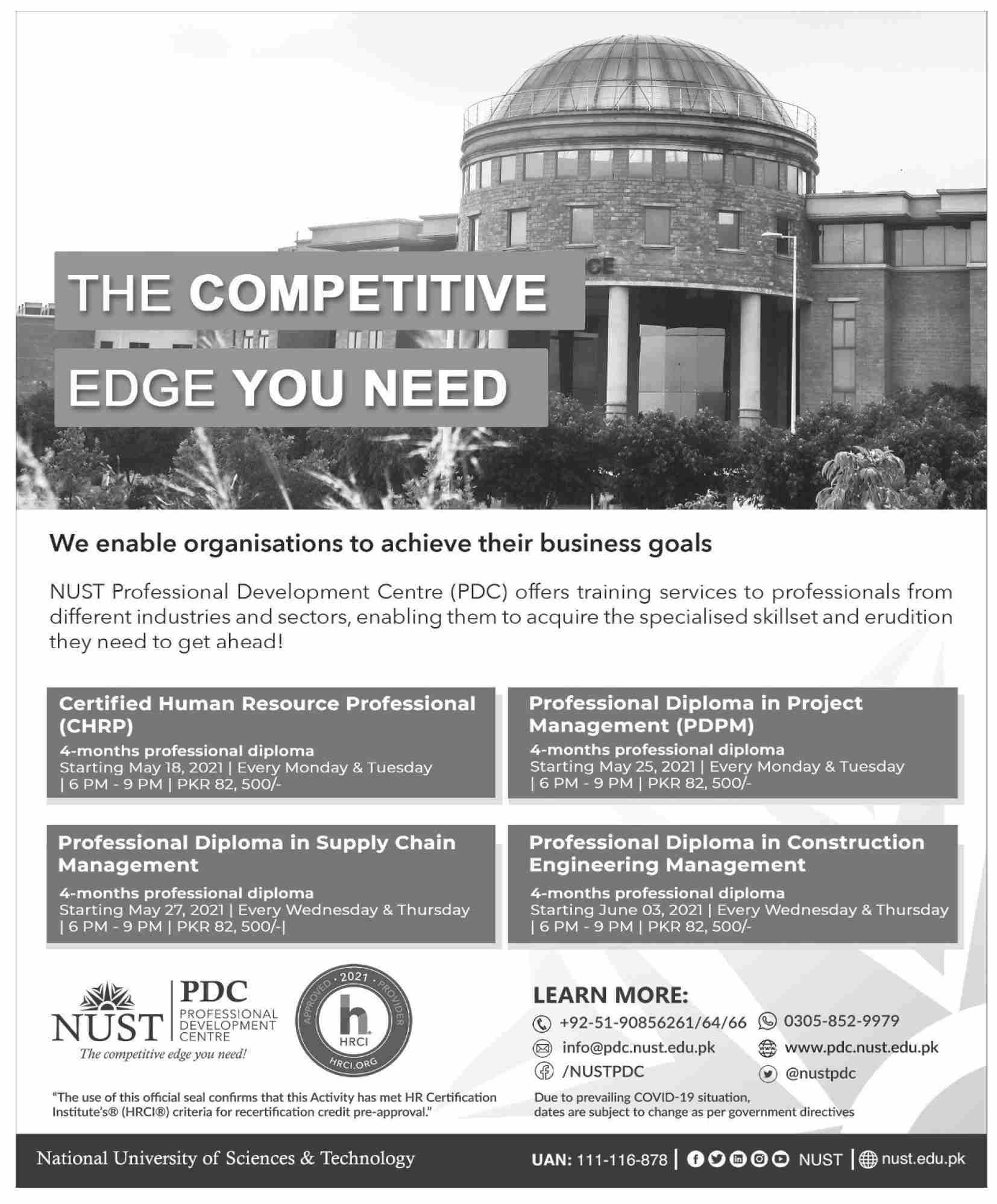 National University of Science & Technology NUST Professional Development Centre PDC is offering admissions for 4 months professional diplomas in Islamabad Pakistan 2021. Read newspaper ad for exact details.