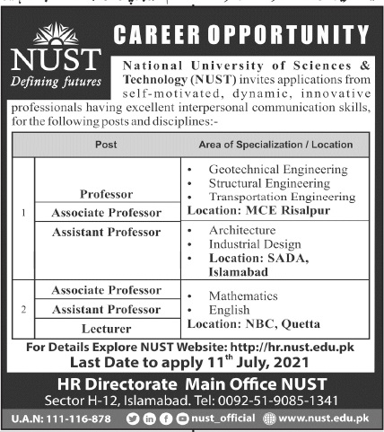 Vacancies in National University of Science & Technology NUST Advertisement June 2021