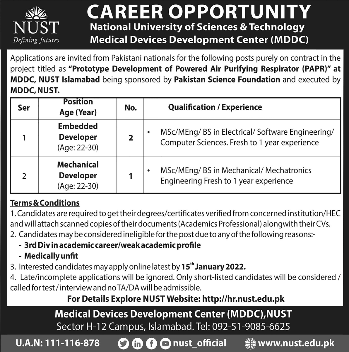 Medical Devices Development Company MDDC, National University of Science & Technology NUST invites applications for job positions advertised in daily Nawaiwaqt dated 11 January 2022 for following vacancies in Islamabad Islamabad Pakistan.