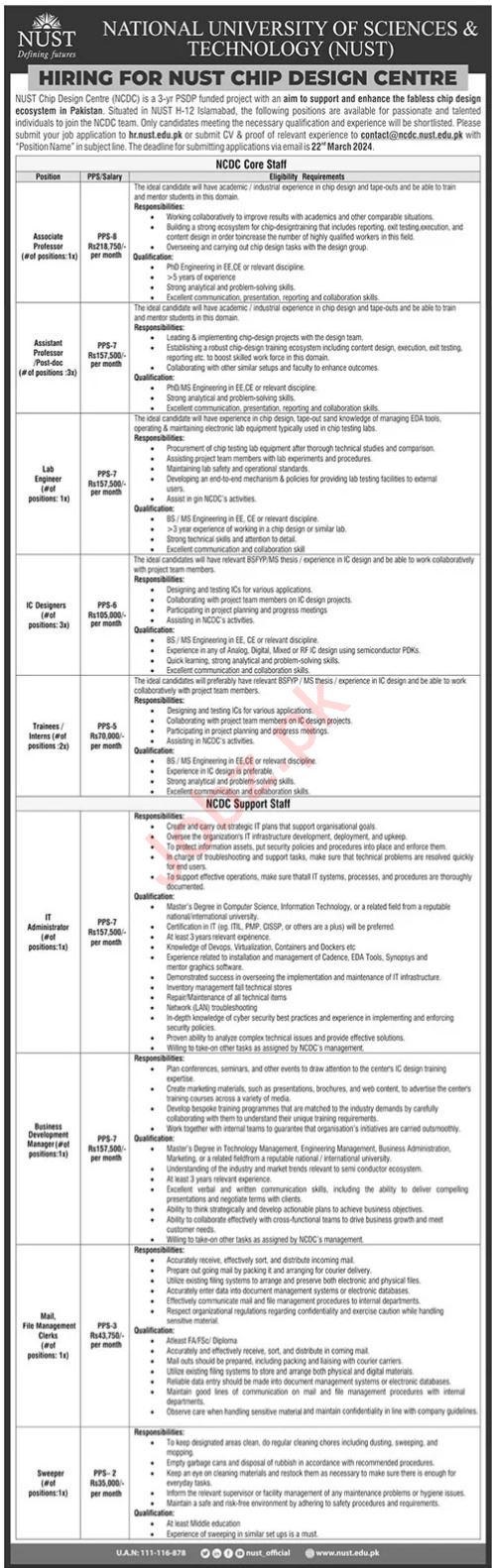 National University of Sciences & Technology NUST is looking for candidates for following posts as per job advertisement published in daily The News Newspaper of March 10, 2024 for location Islamabad, islamabad Islamabad Pakistan: