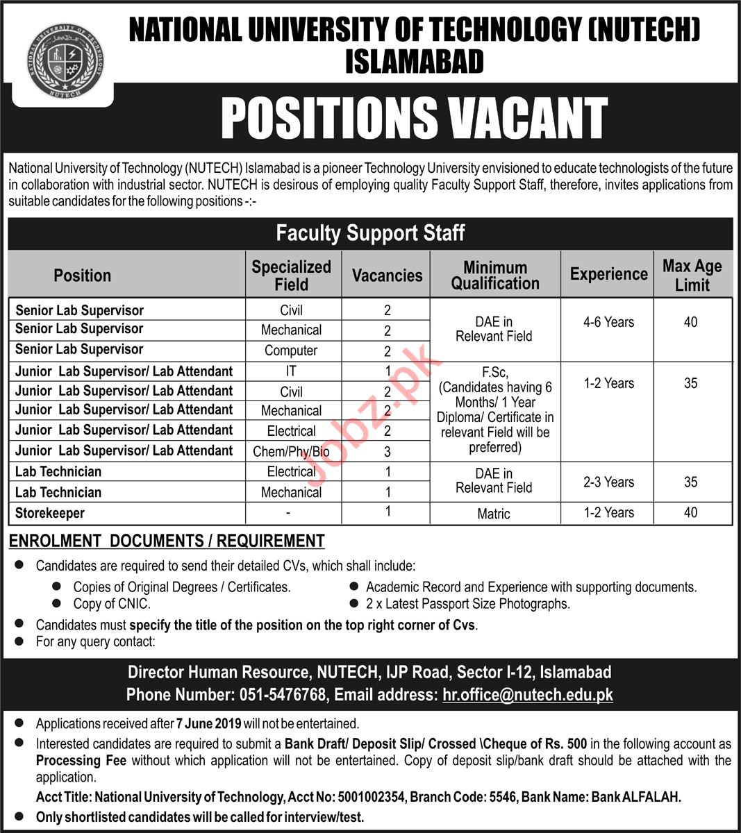 Vacancies in National University of Technology NUTECH Advertisement May 2019