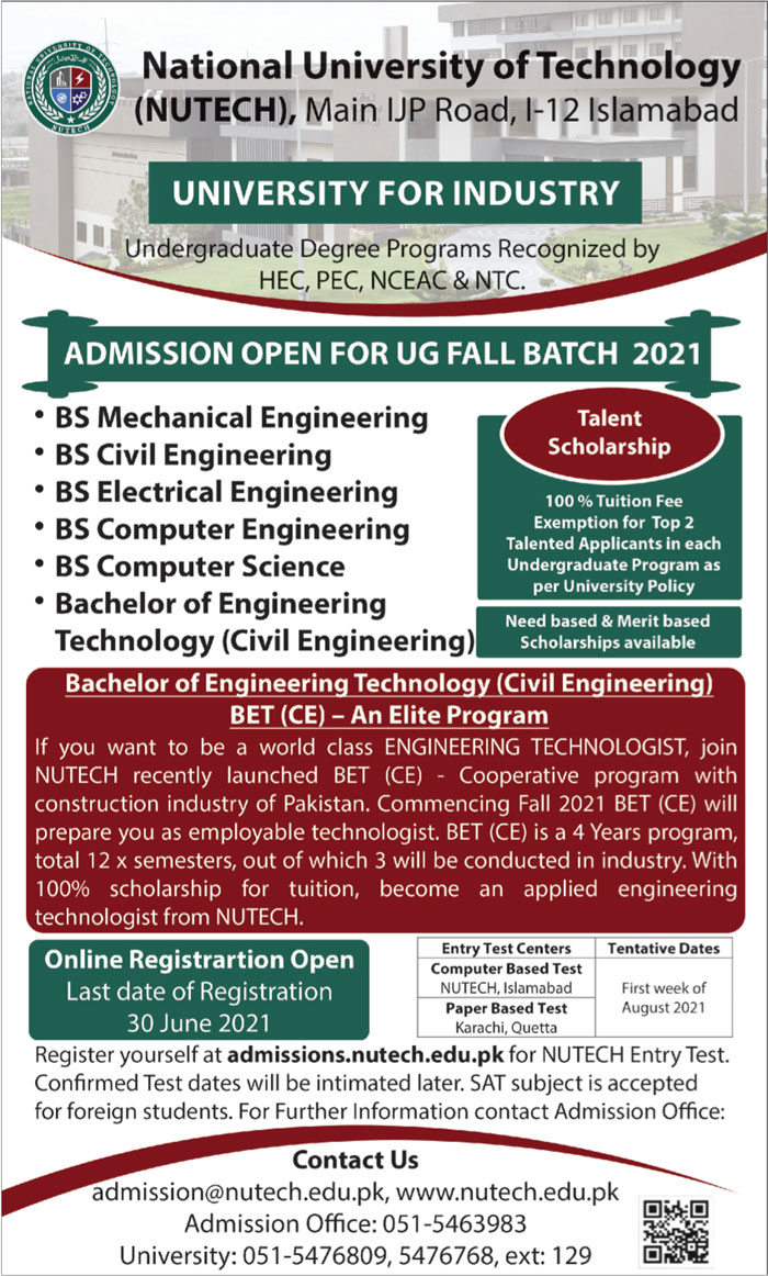 National University of Technology NUTECH invites applications for admissions in BS Mechanical Engineer, BS Civil Engineering, BS Electrical Engineering, BS Computer Engineering, BS Computer Science, Bachelor of Engineering Technology etc. Read newspaper ad for exact details.