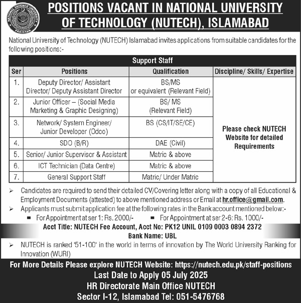 Vacancies in National University of Technology NUTECH Advertisement June 2025