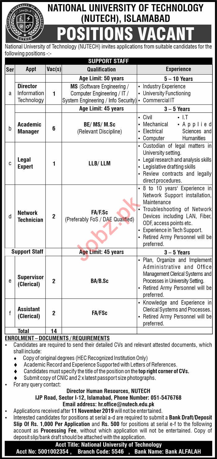 Vacancies in National University of Technology NUTECH Advertisement November 2019
