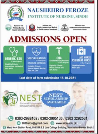 Naushehro Feroze Institute of Nursing has announced admissions for paramedical courses in Generic BSN, Certified Nursing Assistant, Aid Nurse & Assistant Nurse. Read newspaper ad for exact details.