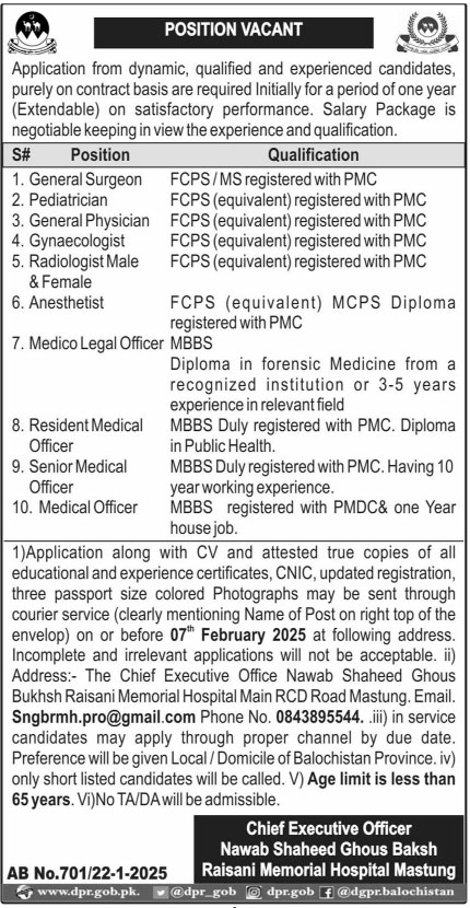 Vacancies in Nawab Shaheed Ghous Bakhsh Raisani Memorial Hospital SNGBRMH Advertisement January 2025