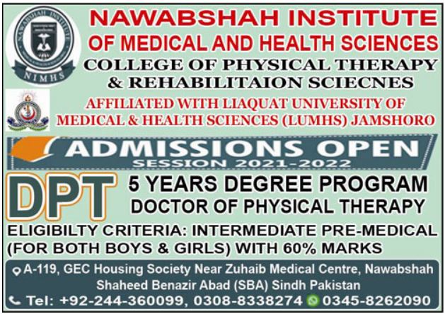 Nawabshah Institute of Medical and Health Sciences Nawabshah is offeringt admissions in the discipline of Doctor of Physical Therapy DPT five year program for session 2021-22. Read newspaper ad for exact details.