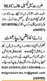 Vacant posts including insurance agent and accountant are announced in Baig Industries Shahdara Lahore, lahore Punjab Pakistan as per 2 June 2025 advertisement in daily Nawaiwaqt Newspaper. Educational qualifications required Others, Bachelor and B.com etc.
