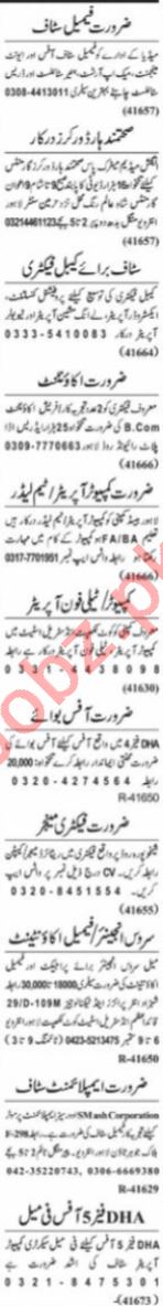 Customer Relationship Officer, Assistant Manager, Branch Manager, Receptionist, HR Officer, Supervisor, Assistant Supervisor, Account Manager, Office Assistant, Salesman, Marketing Staff, Sales Staff, Computer Operator, Sales Manager, Sales Officer, Secretary, Personal Secretary, Peon, Lady Accountant, Graphic Designer, Public Relation Officer, PRO, Assistant, Call Representative, Lady Office Assistant, Front Desk Officer, Cashier seeks in well reputed companies.