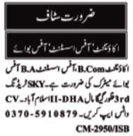 Trading Company DHA Phase 2 - Sector A Islamabad, islamabad Islamabad Pakistan invites applications from eligible candidates for the post of office boy, office assistant and accountant as per advertisement of April 14, 2025 published in daily Nawaiwaqt Newspaper. Persons with Bachelor, Matric, BA and B.com etc. education can apply.