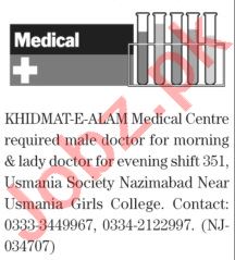 Eye Specialist, Child Specialist, Medical Officer, Radiologist, Nurse, LHV, Doctor, Lady Doctor, Pharmacist, Midwife, Gynecologist, Chest Surgery Specialist, Anesthesia Specialist, ICU Specialist, Internal Medicine Specialist, Chest Specialist, Cardiac Specialist, Digestive System Tract Specialist, Cardic Catheterization Specialist, Back Bone Maroo Specialist seeks in well reputed hospitals.