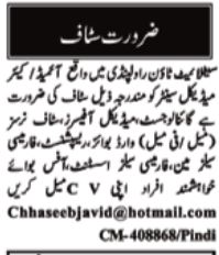 Care Medical Center invites applications for job positions advertised in daily Nawaiwaqt dated 15 September 2025 for following vacancies in Satellite Town Rawalpindi, rawalpindi Punjab Pakistan.