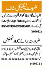 Factory Lahore, lahore Punjab Pakistan invites applications from eligible candidates for the post of lathe machine operator, ac technician and machinist as per advertisement of December 16, 2024 published in daily Nawaiwaqt Newspaper. Educational qualifications required DAE, Intermediate, Matric and Middle etc.