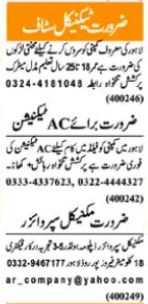 Vacant posts including mechanical supervisor, ac technician and technical staff are announced in Factory Lahore, lahore Punjab Pakistan as per 19 February 2024 advertisement in daily Nawaiwaqt Newspaper. DAE, Matric and Intermediate etc. educational qualification will be preferred.