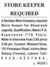 Sanitary Ware Group is looking for candidates for following posts as per job advertisement published in daily Nawaiwaqt Newspaper of March 21, 2022 for location Lahore, lahore Punjab Pakistan: