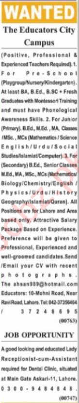The Educators Lahore, lahore Punjab Pakistan invites applications from eligible candidates for the post of social studies teacher, receptionist, urdu teacher, assistant, teacher, female teacher, biology teacher, nursery teacher, montessori teacher, english teacher, computer teacher, science teacher, playgroup teacher, chemistry teacher, preschool teacher, kindergarten teacher and mathematics teacher as per advertisement of November 21, 2022 published in daily Nawaiwaqt Newspaper. Preferred Education is Master, Bachelor and Intermediate etc.
