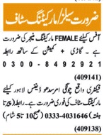 Marketing Company jobs advertisement dated about 23 December 2024 in daily Nawaiwaqt Newspaper invites application for the vacant post of marketing staff, sales staff and marketing manager in Lahore, lahore Punjab Pakistan. Persons with BA, Intermediate and Bachelor etc. education can apply.