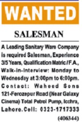 Waheed Sons Ichhra Lahore, lahore Punjab Pakistan invites applications from eligible candidates for the post of sales staff and salesman as per advertisement of June 23, 2025 published in daily Nawaiwaqt Newspaper. Educational qualifications required Intermediate and Matric etc.