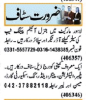 Private Company Lahore, lahore Punjab Pakistan invites applications from eligible candidates for the post of plumber, order taker, labor, electrician, security guard, cook, supplier, mason, welder and painter as per advertisement of June 23, 2025 published in daily Nawaiwaqt Newspaper. Persons with Intermediate, Matric and Middle etc. education can apply.