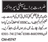 Vacant posts including supervisor and safety supervisor are announced in Multinational Company Multan, multan Punjab Pakistan as per 4 April 2022 advertisement in daily Nawaiwaqt Newspaper. Intermediate etc. educational qualification will be preferred.