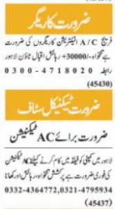 Manufacturing Company jobs advertisement dated about 4 April 2022 in daily Nawaiwaqt Newspaper invites application for the vacant post of electrician and ac technician in Lahore, lahore Punjab Pakistan. Intermediate and Matric etc. educational qualification will be preferred.