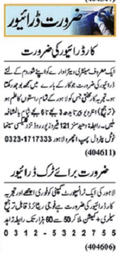 Vacant posts including driver, ltv driver, truck driver and car driver are announced in Private Company Ferozepur Road Lahore, lahore Punjab Pakistan as per 1 September 2025 advertisement in daily Nawaiwaqt Newspaper. Preferred Education is Matric and Middle etc.