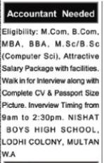 Nishat Boys High School Multan, multan Punjab Pakistan invites applications from eligible candidates for the post of accountant and accounts officer as per advertisement of February 5, 2024 published in daily Nawaiwaqt Newspaper. Persons with B.com, MBA, M.sc and BBA etc. education can apply.
