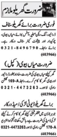 Vacant posts including house maid, cook, patient care, maid, husband wife, driver, office boy, kitchen helper and chowkidar are announced in House Gulshan-e-Ravi Lahore, lahore Punjab Pakistan as per 5 May 2025 advertisement in daily Nawaiwaqt Newspaper. Educational qualifications required Matric, Middle and Primary etc.