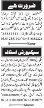 Consultant OPD, Medical Officer, Radiologist, Nurse, LHV, Doctor, Lady Doctor, Pharmacist, Midwife, Gynecologist, ICU Technician, CT Scan Technician, X Ray Technician, Lab Technician, Security Guard, Security Executive seeks in well reputed hospital and companies.