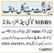 Hospital Clinic Lahore, lahore Punjab Pakistan invites applications from eligible candidates for the post of mbbs doctor, gynecologist, lady doctor, ultrasound doctor and doctor as per advertisement of March 7, 2022 published in daily Nawaiwaqt Newspaper. Candidates with Intermediate, Others, MBBS and Bachelor etc. educational background will be preferred.
