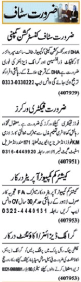 Private Company Lahore, lahore Punjab Pakistan invites applications from eligible candidates for the post of draftsman, computer staff, computer operator, site supervisor, factory worker, graphic designer, social media marketing expert, architect, accountant and cashier as per advertisement of October 7, 2024 published in daily Nawaiwaqt Newspaper. Matric, Middle, Intermediate, B.com, Bachelor and BA etc. educational qualification will be preferred.