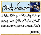 House Lahore, lahore Punjab Pakistan invites applications from eligible candidates for the post of helper, factory staff, driver, husband wife, patient care, cook and office staff as per advertisement of February 10, 2025 published in daily Nawaiwaqt Newspaper. Educational qualifications required Middle, Primary and Matric etc.