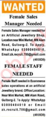 Vacant posts including sales manager and sales officer are announced in Jewelry Brand Lahore, lahore Punjab Pakistan as per 10 June 2024 advertisement in daily Nawaiwaqt Newspaper. Educational qualifications required Intermediate, Matric and Bachelor etc.