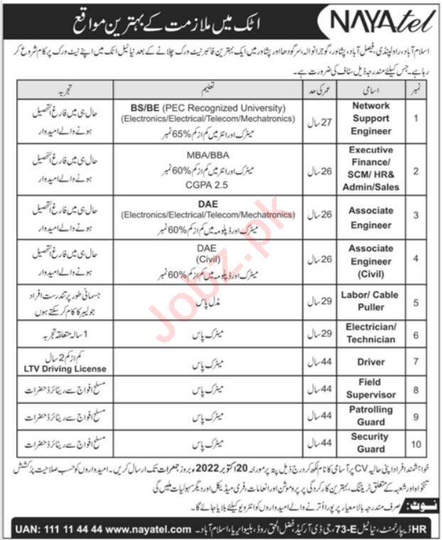 Nayatel Pvt Limited invites applications for job positions advertised in daily Jang dated 2 October 2022 for following vacancies in Attock, attock Punjab Pakistan.