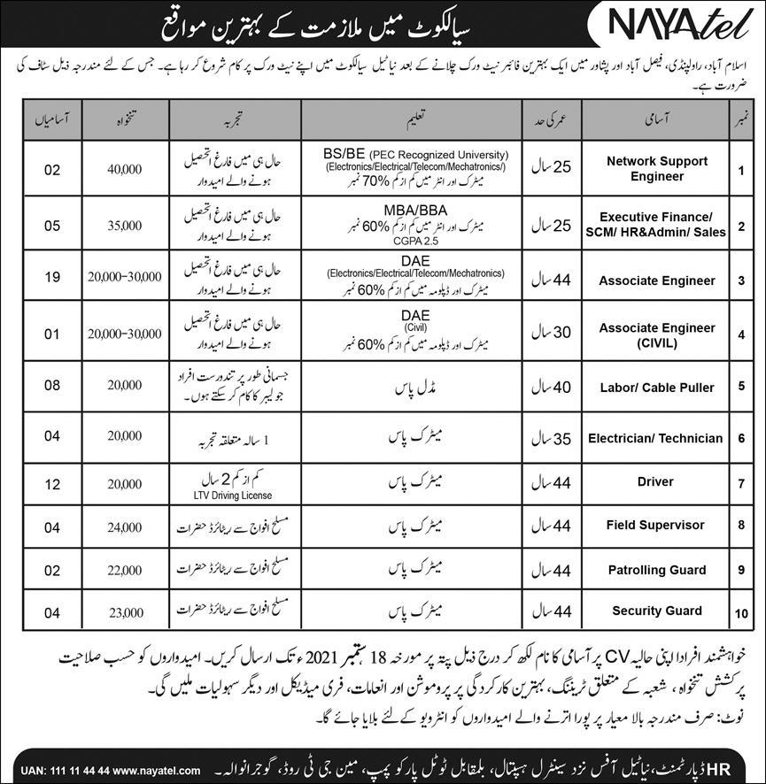 Nayatel Pvt Limited is hiring experienced, hardworking and dynamic candidates for the posts of Network Support Engineer, Executive Finance, HR, Admin and Sales Staff, Associate Engineer, Associate Engineer Civil, Labor, Cable Puller, Electrician, Technician, Driver, Field Supervisor, Patrolling Guard, Security Guard in Sialkot.
